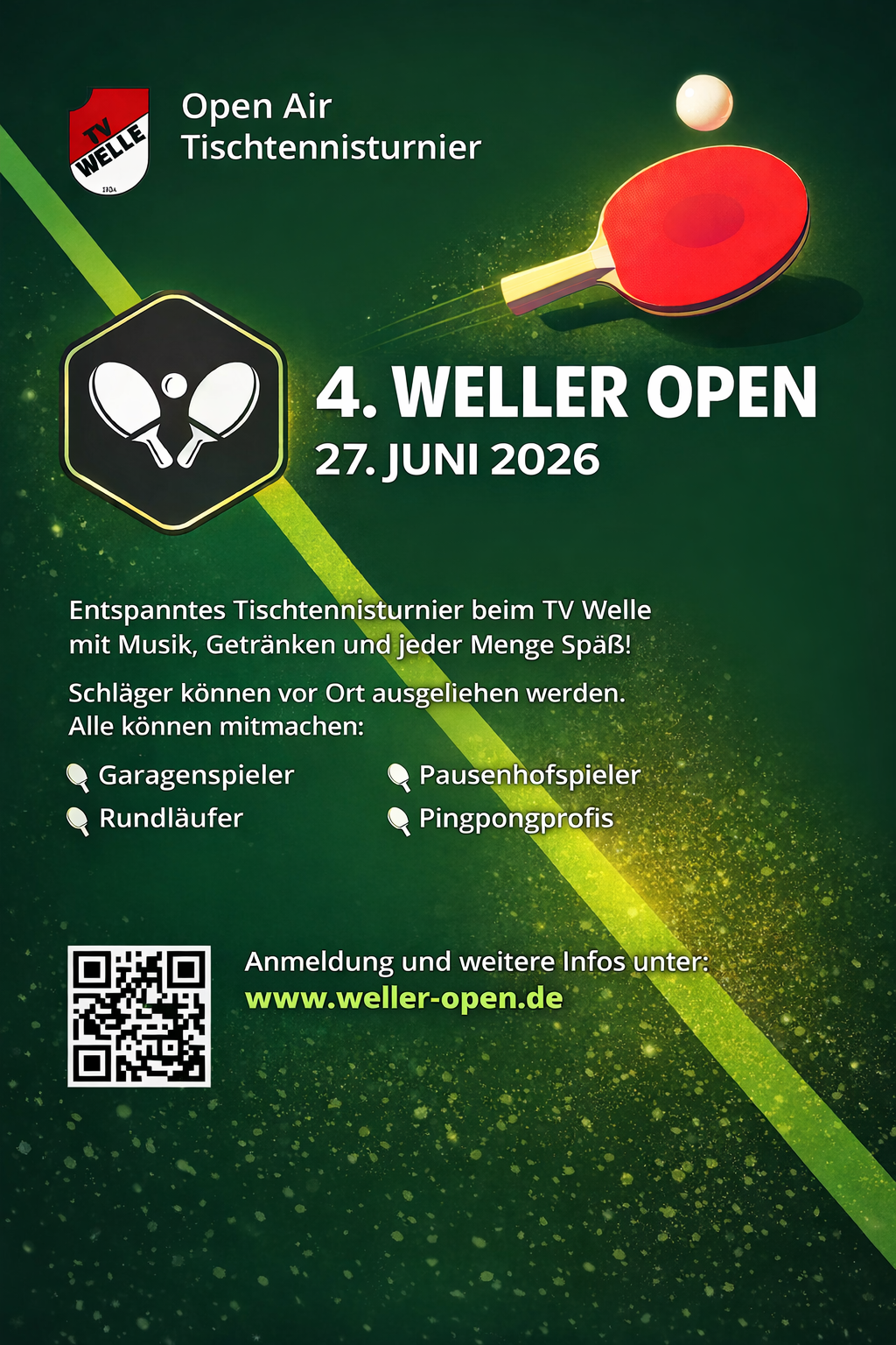 Am 27.06.2026 findet das 4. Weller Open statt. Das Weller-Open ist ein Tischtennisturnier für alle Spaßspieler aus der Nordheide und Hamburg.